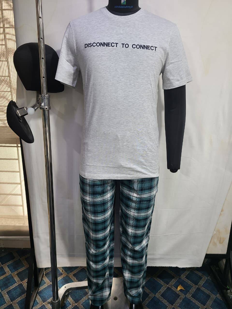 KNITTED TEE WOVEN PAJAMA SET DISCONNECT TO CONNET/LT GREY MARL / GREEN CHECK