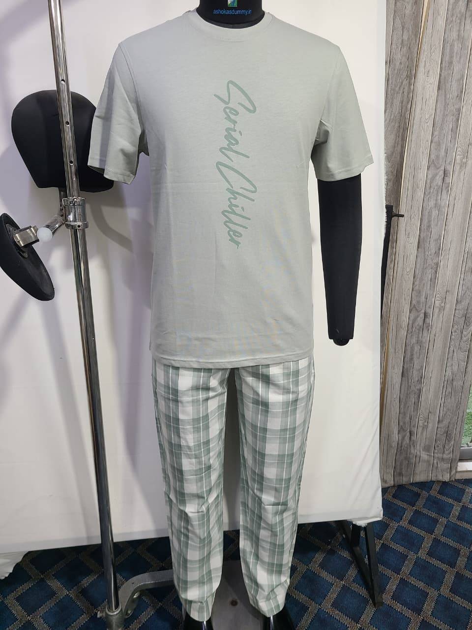KNITTED TEE WOVEN PJ SET SERIAL CHILLER/AQUA GRAY / GREN STRIPES