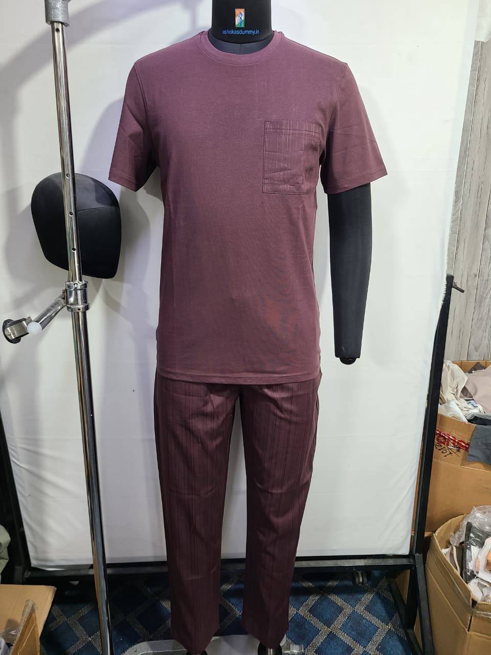 KNITTED TEE WOVEN DOBBY PAJAMA SET/BURGUNDY