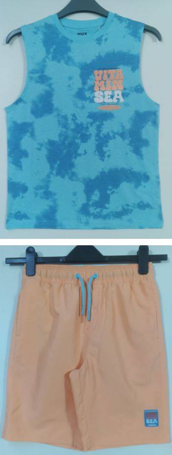 TIE DYE AOP WITH BACK PRINT VEST AND SHORT SWIM SET/VEST - BLUE AOP AND SHORTS ORANGE NEON